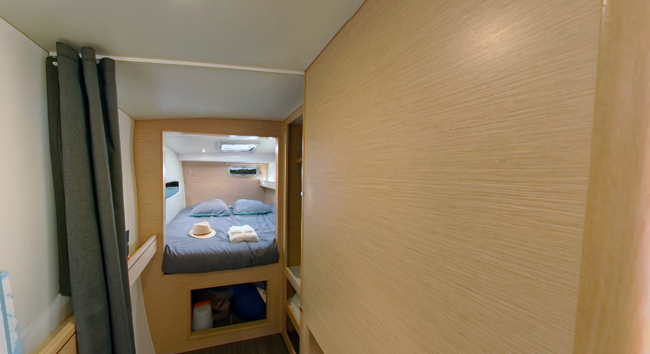 The port side has an aft queen bunk and a single bunk forward, with a shared bathroom in the middle. To reduce weight, there are zipper fabric dividers instead of solid doors for privacy in the guest cabins and bathroom.