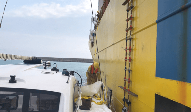 First we were asked ot come alongside the ship. The loading crew climbed down the boarding ladder and positioned the lifting slings in place. A diver was under the boat to verify the slings were positioned correctly.