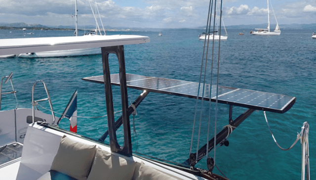 Our main source of renewable energy comes from 4 x 150 Watt solar panels mounted on the davits. These are charging two 180 Ah lithium batteries. I know from experience that 600 Watts isn’t enough and we will need to run the engines to top up the batteries using the alternators. My ideal capacity for our needs is around 1000 Watts of solar, so we needed to find another 400 watts, and for that we turned once again to our friends at Gunboat!