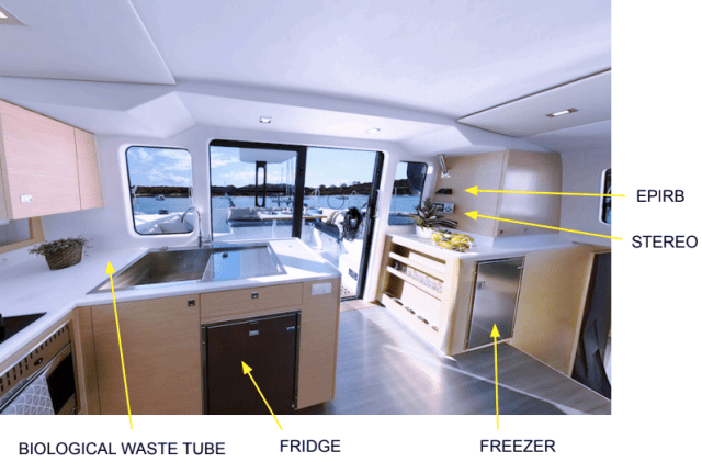 - A bio waste tube on the counter beside the sink to drop foodscraps overboard when doing dishes underway