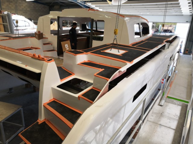 Our 4X is number 44 in the production series. That doesn’t mean that Outremer have made 44, 4X boats, but rather the 4X shares the production numbers with the 45. The 4X is identical in most ways to the 45, and they both use the same molds. The 4X uses more carbon fiber, has a modified sailplan, has some weight saving changes to the interior, and has a different standard options package, but aside from that it’s the same as a 45. In any case, it’s good to know that Outremer have had 43 previous boats to practice on, so they can build us a perfect 4X number 44 🙂