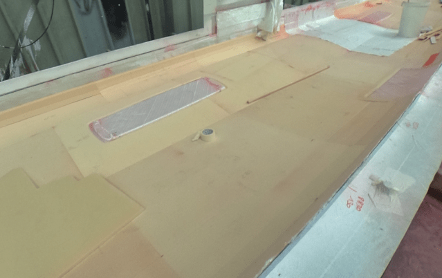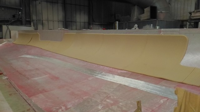 The typical method of resin infused layup with foam core uses sheets of foam with narrow grooves cut into them in a cross hatch, creating 1 cm squares over the entire sheet. This allows the foam to conform to the curves of the hull surface and maintain an even core thickness. When the resin is pumped into the molds under vacuum during the infusion process, all of these little grooves act to channel the resin so it flows evenly over the entire surface, but they also remain filled with resin, and over a large area this constitutes a significant amount of weight that has no structural benefit.