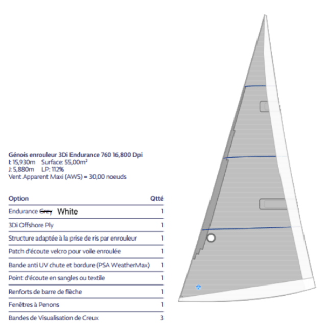 We chose North 3Di Endurance for our 68 square meter mainsail. The sail is fully battened with three reef points. We added three colored lateral bands to assist with trimming. Although the sail in the image has numbers on it, we deleted the sail numbers from our sail. They’re ugly and unnecessary for cruising.