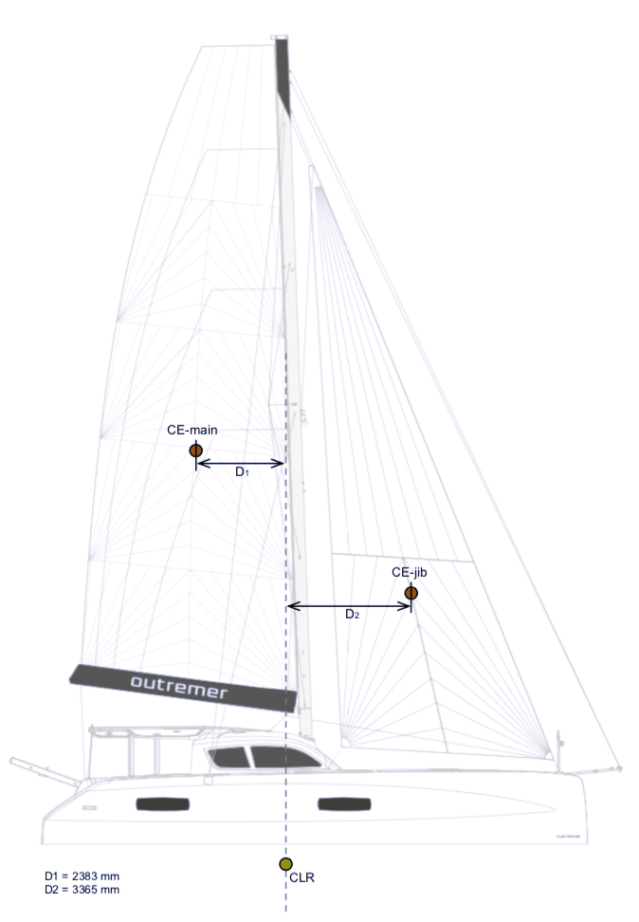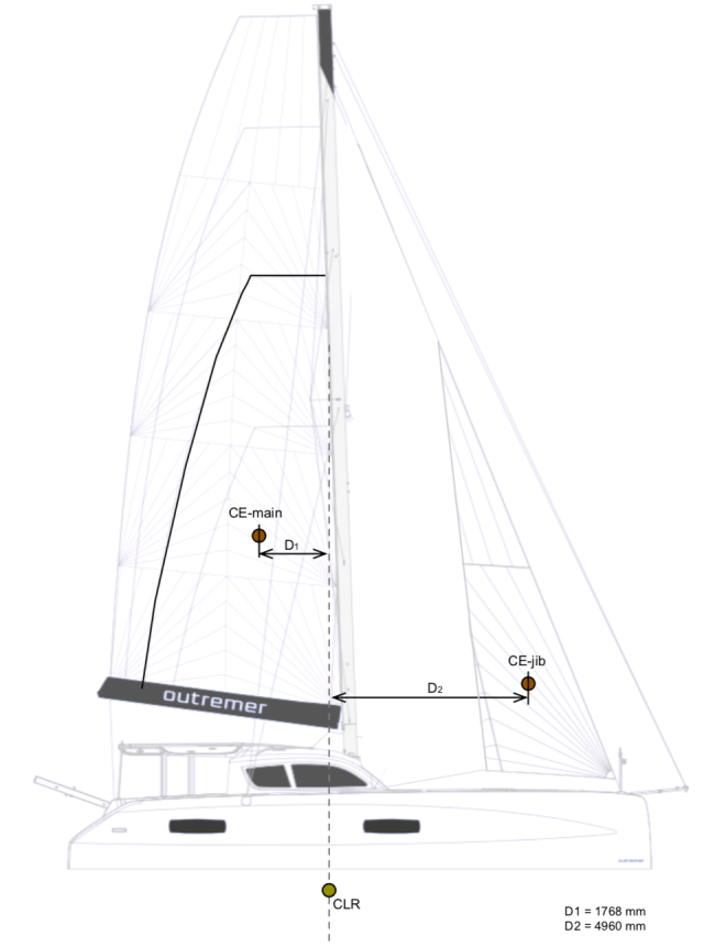 Full mainsail and jib on a balanced rig. Locations and distances on this diagram are my own estimates, taken from a scaled drawing. This data is not provided by, or endorsed by Outremer, I’m just trying illustrate the point.
